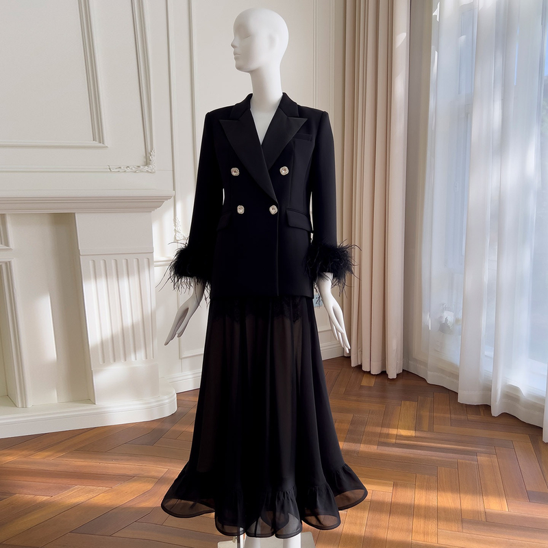 Designer's Concept: The loose H-line silhouette exudes a "film producer" vibe—slimming yet textured, with built-in shoulder pads that enhance the head-to-shoulder ratio, boosting the wearer's presence. The cuffs feature real plush fur, light and fluffy, and are detachable. The skirt hem uses (piecing) to increase fullness, giving the skirt a blooming flower bud effect. A 1cm (stiffening tulle) is added at the hem, making it both lively and shapely.