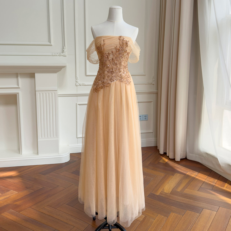 Champagne Off-the-Shoulder Embroidered Tulle Gown69642