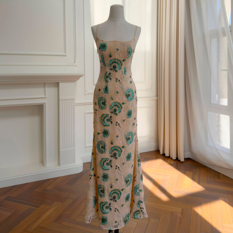 Champagne Halter 3D Floral Tulle Maxi Dress69658