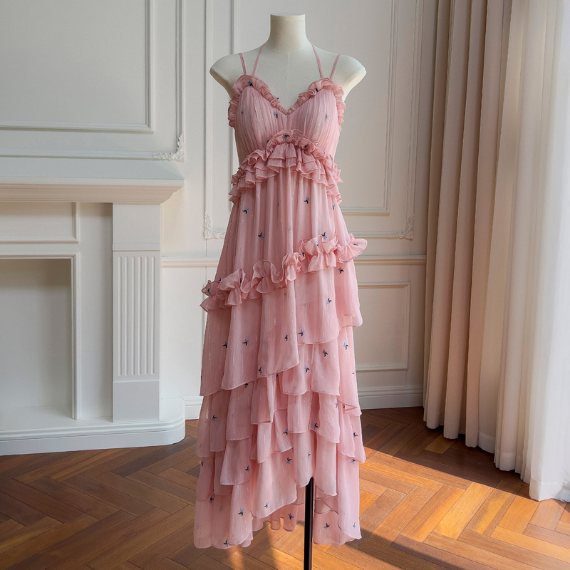 Dusty Pink Spaghetti-Strap Ruffle Tiered Dress69082