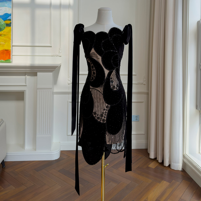 Champagne Strapless Beaded Bow Flared Mini Formal Dress69601