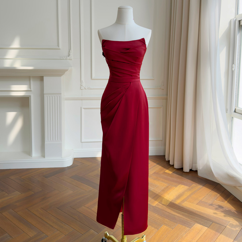 Vintage Burgundy Strapless Ruched Midi Gown69676