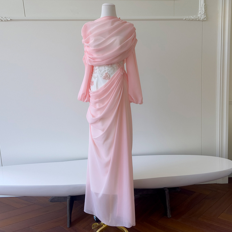 Vintage Luxury Elegant Slim Fit Pleated Bodycon Dress with Splicing 3D Embroidery Evening Gown69551