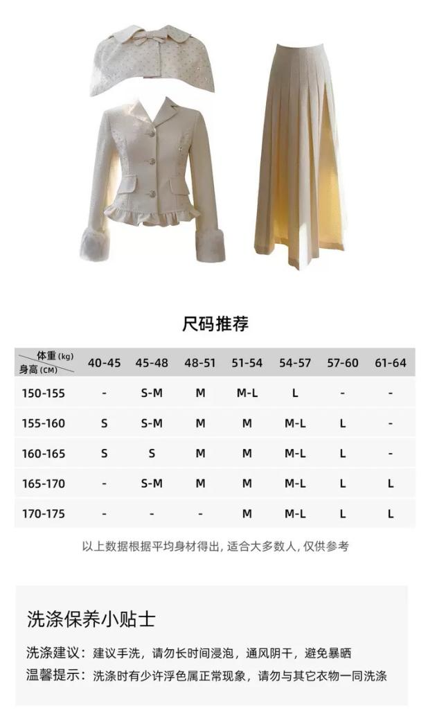 Designer's Concept: The simple cape silhouette creates a vintage ambiance, adorned entirely with sequined flowers stitched across—three-dimensional and textural, exuding a delicate, elegant charm that embodies grace and poise. Every movement reveals subtle allure. The soft cream white, brimming with the gentle hues of autumn and winter, fosters a beautiful, intellectual atmosphere. The plush cuffs are detachable.
